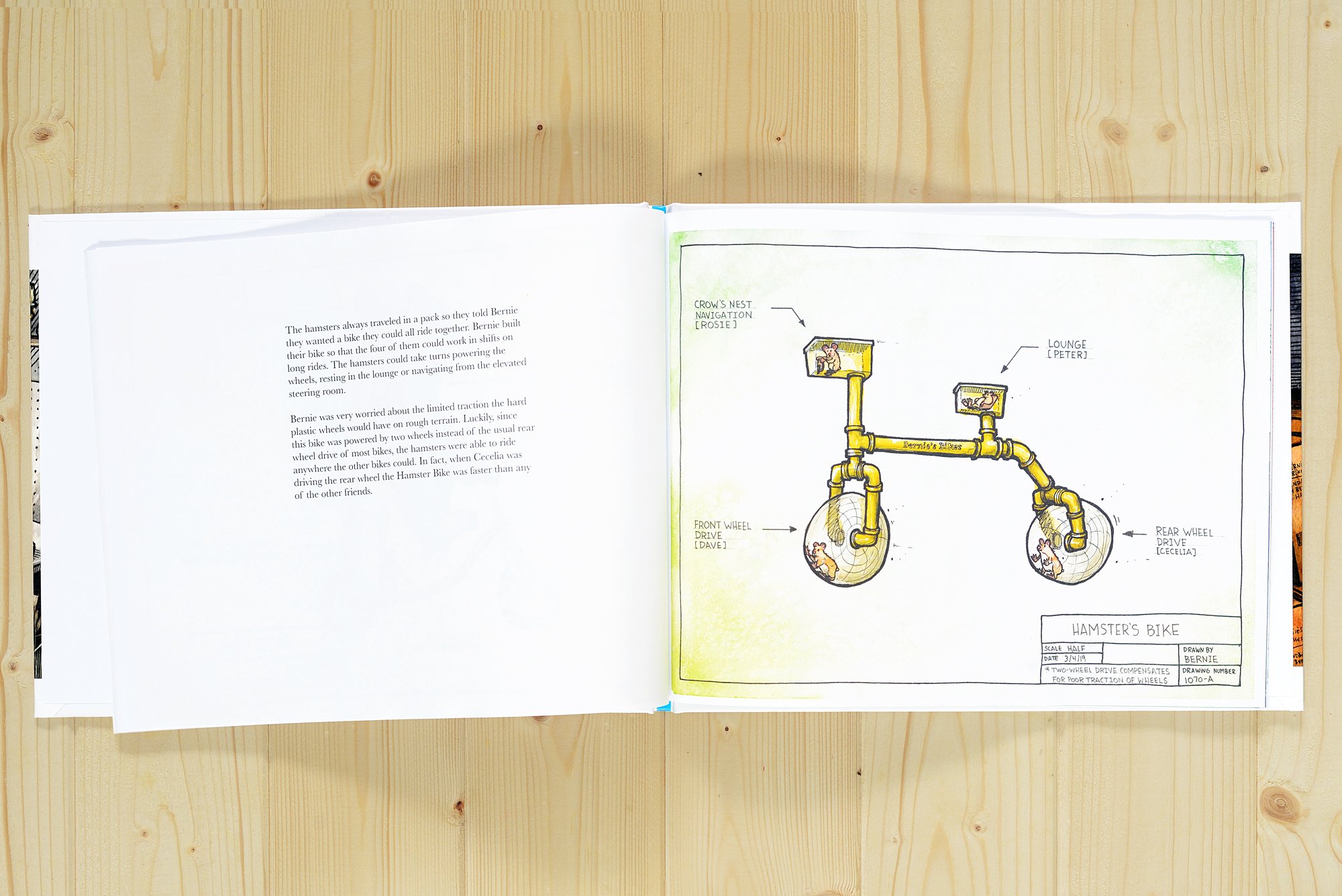 "Bernie is one of the top bike builders in the world. His bikes are so fast and so beautifully made that bike racers and wealthy bike collectors alike buy up every bike he can make. It is sad to him that the bikes he builds all end up being sent far away and that none of his close friends seem interested in them. After a talk with his friend Monty the Corgi, Bernie learns that his friends (who are not bike racers) think they can't fit on his high-performance-built-for-speed bikes. Bernie sees this as a design challenge and sets to work building bikes his friends can ride.